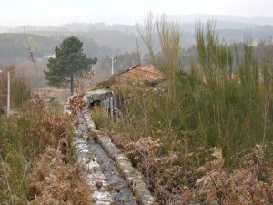 26,210 Dejamos la carretera tomando el sendero a nuestra derecha que nos conduce al Muiño de Ceo, tal como indica el poste indicador. Bajamos hasta O Rego de Espadaneira y seguimos por un camino entre muros. Una subida nos lleva al barrio de Fondo da Vila.