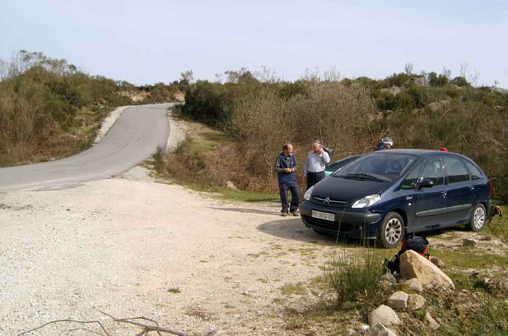 En esta ocasión hemos inciado el recorrido por la ladera sur de la sierra. Hay que atravesar La Cañiza y seguir por la N120 hasta el cruce que hay unos metros después del rótulo que indica el término de la provincia de Pontevedra. Se toma la carretera a la izquierda que lleva a Cortellas y a la cantera de Roca Mineras. Dejamos el coche en una pequeña explanada, frente al puente del Regato de La Cabana y tomamos la pista de jabre que sube al parque eólico.