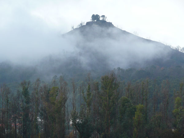 El cono de A Peneda se insinúa entre la niebla. Más adelante se encuentran hermosos parajes como el de la imagen.