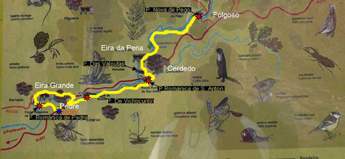Salimos de la aldea Pedre, situada en la carretera de va de Pontevedra a Orense, la N531, poco antes de Cerdedo. La ruta está bastante bien señalizada con las marcas blanca y amarilla de los PRG, aunque el comienzo es bastante confuso, pues una vez que se llega a Serrapio, se pierden las marcas hasta llegar a la carretera Pontevedra-Orense. Es más seguro comenzar en Aciveiro.