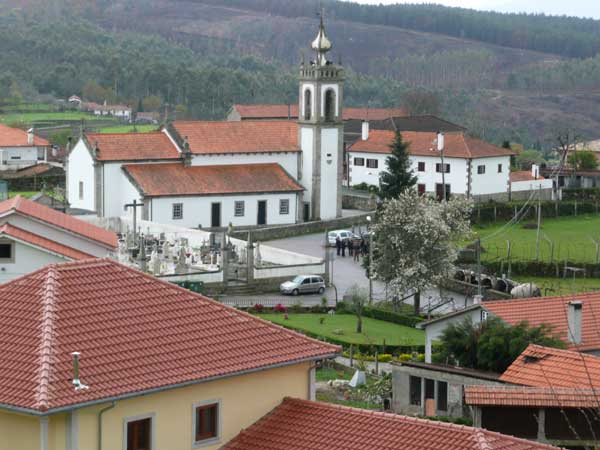 Terminada la Semana Santa, estas rústicas estaciones del Via Crucis cambian los lienzos morados por los blancos. A la derecha, vista de la iglesia de Cunha, parroquia en la que se inicia la ruta.