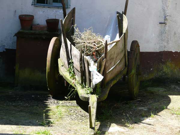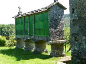Llama la atención este hórreo pintado de rechamante verde pero más aún, por lo incomprensible, este motor abandonado en medio del precioso camino.