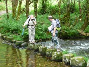 Adrián y Ángel intentan atravesar el río por estos curiosos pasos semejantes a los famosos pasos de Tatín en el Tea. No lejos de su nacimiento el Lérez es regato, alevín de río.