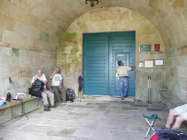 Ya que el monástico hotel no atiende a caminantes, reponemos fuerzas aposentándonos en los bancos de la entrada. A la derecha, el mapa de la ruta.