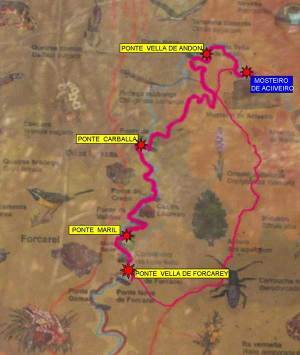 La armoniosa y constante belleza del tramo intermedio de hace dos semanas, se rompe en este último ya que, aún manteniendo los siempre hermosos parajes que nos deparan las riberas de los ríos, llega un momento en que el camino se hace intransitable y se separa del río desviándose por los montes de Valiñas y Furada, de vegetación rasa, huérfanos del arbolado y la frondosidad a que nos tenía acostumbrados el sendero fluvial, castigados por un sol inclemente hasta alcanzar de nuevo el tramo practicable que nos lleva al puente viejo de Andón, cerca ya del monasterio de Acibeiro.