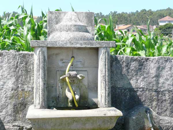 Desde Tourón reemprendemos la marcha hacia Contixe bajo un sol de justicia, a 34ºC, sin una sombra, pues estos parajes hasta hace dos años frondosos y umbríos por la espesa arboleda que los defendía del sol, son ahora monte seco, pelado, arrasado por los catastróficos incendios del verano del 2006. Muchos han de pasar para que estos montes recobren aquel paisaje de sombra y frescura que el fuego borró.