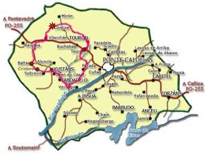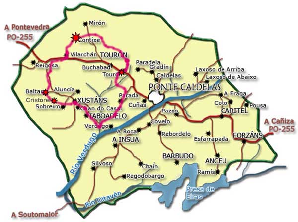 En estos días de pleno estiaje cuando el sol aprieta en todo el país con temperaturas que pasan de los 34º, se nos ocurre hacer un recorrido por los montes que se encuentran entre Pontevedra y Pon tecaldelas. Partiendo de Contixe cuya situación pude verse en el mapa más abajo, nos dirigimos por el GR 94, llamado también Sendero Rural de Galicia, hasta el lugar de Baltar, llegando un poco más arriba al monte de Cristorei. Comenzamos ahí un descenso hasta el cuce donde abandonamos el GR 94 y seguimos, atravesando la aldea de Xustáns, hasta el fondo de la vaguada donde atravesamos un afluente del río Verdugo. Desde allí una fuerte subida nos lleva hasta la pareroquia de Tourón en cuya carballeira nos detenemos para comer y descansar con baño incluído en la piscina que allí está instalada.