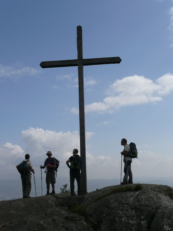 La Cruz de Ermelo se yergue, impresionante, sobre una gran roca. Es la Cruz de Santiago en piedra dominando la ría de Pontevedra. La cruz del Paralaia es de madera y desde la roca donde está se contempla desde muy cerca la ría de Vigo en todo su esplendor. Un poco más abajo, ya en el camino de vuelta, nos detenemos en el parque forestal de O Pouso das cruces, un merendero con mesas y fuentes de piedra, sitio ideal para interrumpir la marcha, comer y descansar.