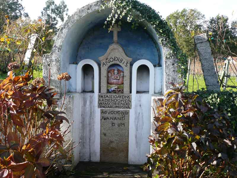 En este rústico y encantador peto de ánimas reza la siguiente inscripción: «Pasajero, ay de nos ardiendo y que tú vayas corriendo sin dar limosna». A la derecha, esta casa cuyo estridente color azul es capaz de resucitar a los difuntos del cementerio anexo.