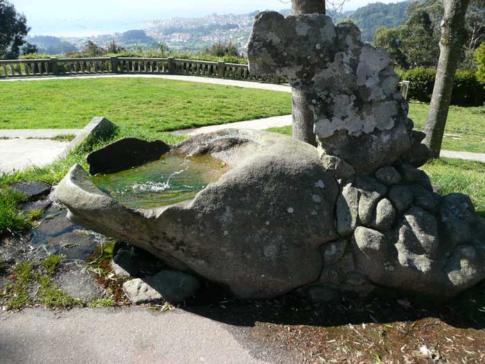 Curiosa fuente de piedra en O Mirador da Fraga. La subida al Paralaia transcurre por umbrías corredoiras entre carballeiras.