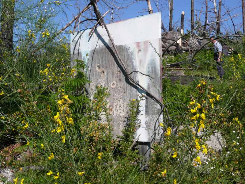 En éste ya no se lee nada. Fijándose bien y guiados por el folleto suponemos que se trata de A laxe de O capadoiro o de Os cabalos. Ha sido borrado por el incendio de 2006, seguramente. El fuego afectó a la roca que ha estallado en algunos sitios, como puede apreciarse en la foto.