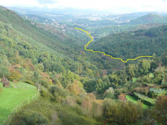 Tierras de cultivo, casi todas praderas robadas al monte en forma de bancales conforman el paisaje de la sierra de Anta salpicadas de pequeñas aldeas en sus laderas. A la derecha una imagen del profundo valle por el que discurre el primer tramo del sendero,marcado con trazo amarillo, paralelo al río Sucrasto.
