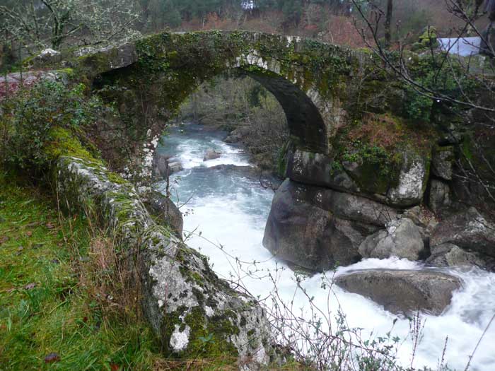 La última vez que hicimos esta ruta fue en mayo de 2008, en un día típico de primavera soleado y con agradable temeperatura, bien distinto al de hoy, lluvioso, fresco y con niebla en los montes de Xesteira. Pero como compensación de las incomodidades que origina el mal tiempo tuvimos la oportunidad de contemplar al río Almofrey en toda su belleza, crecido como un torrente de fuerza y espuma, rompiendo con furia sobre las rocas que conforman su cauce, bajo un hermoso puente en un paraje sorprendente y encantador.