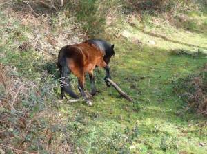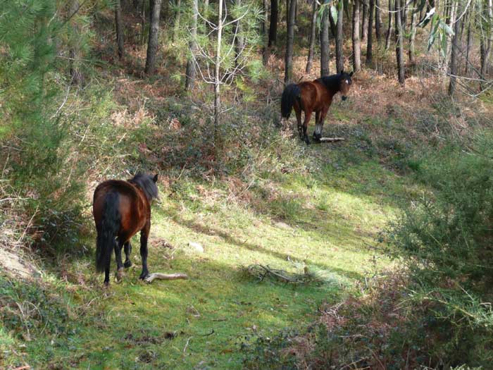 Precisamente aquí, en pleno monte, nos hemos topado con el triste espectáculo de un par de caballos cojeando a causa del cepo de madera con el que lo torturan para limitar sus movimientos. En esta ocación, como en otras tantas, observamos que el contacto con la naturaleza no mejora la sensibilidad de la gente del rural hacia los animales ni hacia su entorno en comparación con las personas que viven en las ciudades. Caballos torturados, perros ladradores que acosan al caminante a su paso, hórreos pintarrajeados, chatarra abandonada en medio del monte y muchos ecéteras más, son muestras de la degradación que sufre el medio rural aquí en Valga y en muchos otros sitios.