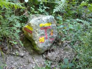 Dos originales maneras de señalar el camino. La cruz pintada en la piedra indica que un poco más arriba se encuentra la iglesia románica de San Pedro de Rubiâes.