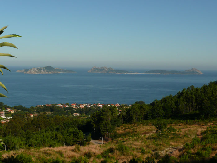 A pocos metros del inicio se encuentra el sendero de largo recorrido, el GR-53, desde donde se pueden contemplar hermosas vistas de la ría como ésta que muestra las islas Cíes.