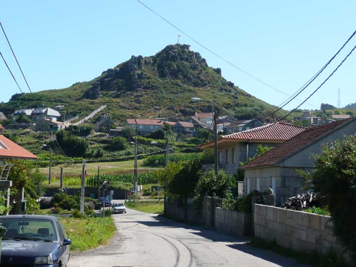 La llegada a Chadebrito es por un estrecho sendero lleno de vegetación y cubierto de aguas fecales cuya fetidez deshace el encanto de este rústico acceso. A la derecha el monte de O Castro.