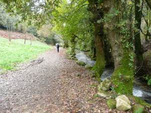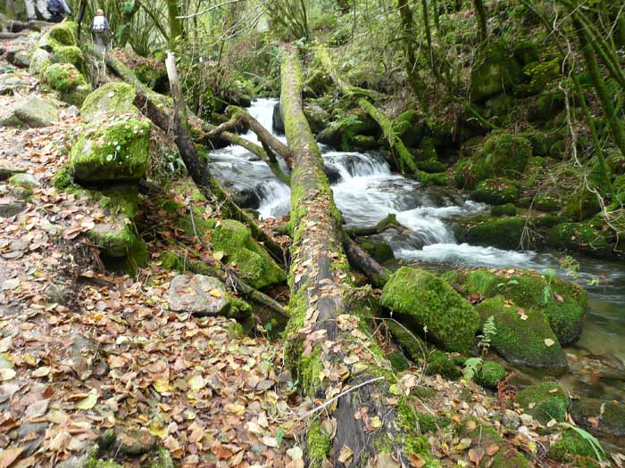 Después de pasado el campo de golf de Meis, siempre descendiendo, llegamos hasta la Ruta da Pedra e da Auga un bellísimo recorrido que partiendo de Barrantes sigue río arriba hasta llegar al monasterio de Armenteira. El frondoso bosque de ribera conforma hermosísimos parajes a lo largo del cuidado sendero. Una idea de la variedad de especies que crecen en ambas márgenes del río Armenteira la da este párrafo que he copiado y traducido de uno de los paneles: