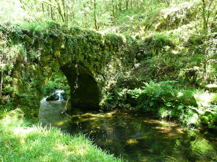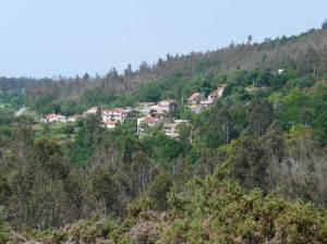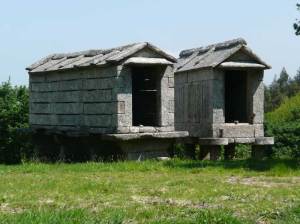 Casi escondida en la frondosidad del bosque se encuentra la aldea de A Graña. A la derecha dos hórreos gemelos, con cubierta de piedra, muy abundantes en la zona.