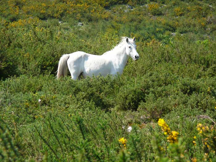 Para llegar a la carballeira en la que se encuentra el foxo do lobo hay que atravesar este monte de tojo por el que pastan tranquilamente una manada de caballos de la que sobresale este hermoso y excepcional alba plena.
