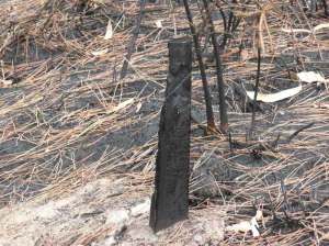Gran parte de los pinares que rodean al convento han sido arrasados por los recientes incendios que han afectado incluso a los postes indicadores de la ruta.