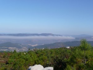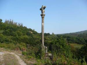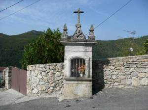Ya de regreso, un poste indicador nos dirige hacia Ponteceso. Ahora caminamos seguros, siguiendo las marcas blancas y amarillas del PRG hasta a Pedra da Serpe hasta que volvemos a encontrar otro poste que nos indica que debemos seguir hacia arriba y de nuevo perdemos la costa y volvemos al monte, en fatigosa ascensión, debido sobre todo al extremo calor y escasa sombra. A medida que subimos vemos como el mar se aleja cada vez más hasta que recuperamos de nuevo O Alto das Travesas ya cerca de Ponteceso.