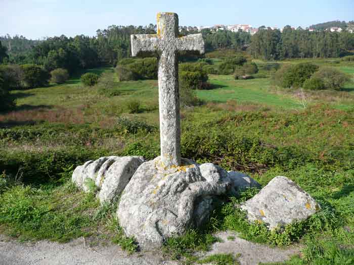 Ya de regreso, un poste indicador nos dirige hacia Ponteceso. Ahora caminamos seguros, siguiendo las marcas blancas y amarillas del PRG hasta a Pedra da Serpe hasta que volvemos a encontrar otro poste que nos indica que debemos seguir hacia arriba y de nuevo perdemos la costa y volvemos al monte, en fatigosa ascensión, debido sobre todo al extremo calor y escasa sombra. A medida que subimos vemos como el mar se aleja cada vez más hasta que recuperamos de nuevo O Alto das Travesas ya cerca de Ponteceso.