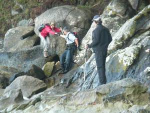 Aunque los pronósticos auguraban lluvia para esta mañana, lo cierto es que lució un sol espléndido que hizo que esta ruta, ya hermosa de por sí, se convirtiese hoy en un recorrido de espectacular belleza no exenta de riesgos pues, a poco de salir de la playa de Vilariño, punto de inicio de la caminata, en el tramo de playas nos vimos obligados a pasar por las rocas en vez de por la arena debido a la marea alta que hacía llegar las olas hasta nuestros pies, con gran riesgo de resbalones, caídas y mojaduras, como sucedió a más de uno al ser alcanzado por la ola que iba y venía. Era necesario aprovechar el corto tiempo entre el flujo y reflujo de las olas para atravesar por las rocas mojadas. Demasiada rapidez podía provocar una caída y excesiva lentitud supondría una baño de agua salada. Por desgracia para unos y regocijo para otros ambas cosas ocurrieron aunque sin mayores consecuencias.