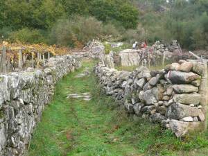 Hermoso camino entra muros de piedra y pista forestal en la subida a Coto Agudo.
