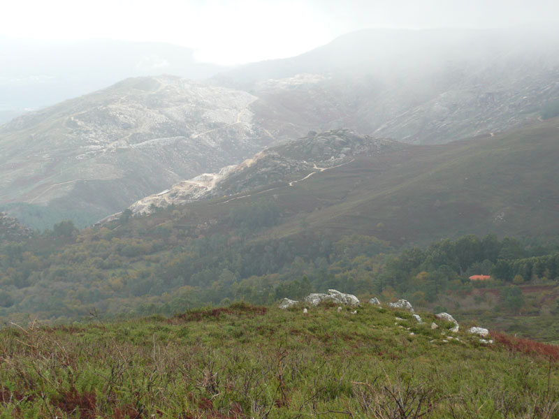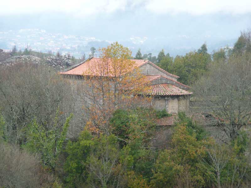 Pues en esta mañana que amenazaba lluvia y que resultó ser una estupenda jornada para senderear, repetimos la visita pero cambiando de ruta. Bajamos de Monte Faro hasta cerca de la granja Melim y, bordeando su ladera, nos acercamos hasta la ermita de S. Ouvidio desde donde se divisa el conjunto monacal de San Fins. Dando un pequeño rodeo para disfrutar del hermoso paisaje conectamos con el trilho PR7, denominado Entre mosteiros, pues va desde el de Ganfei al de San Fins, y no tardamos en llegar a los dominios del este antiguo cenobio, construído en el XII, reformado más tarde, en el XVI, cuando lo ocuparon los jesuítas.