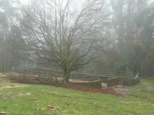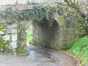Viniendo del cercano Vincios, pasada la iglesia dejamos el coche un poco más abajo en el puente de carretera que hay en el lugar de Gonda y, subiendo por una empinada cuesta, pasamos cerca de la citada finca del pintor y nos encontramos con una larga acequia que por estos lares llaman levada, pues transportaba el agua desde un lejano punto más alto en el río hasta los muiños de la localidad. El agua la sigue llevando pero los muiños hace mucho tiempo que están inactivos.