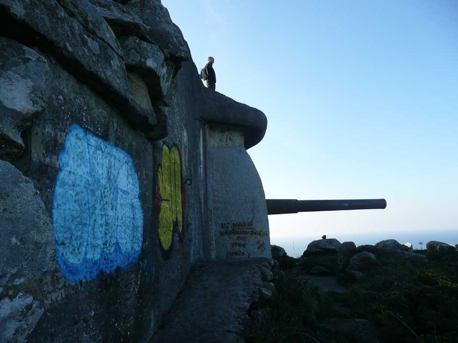 Uno de los fieros cañones, ahora pintarrajeado. A la derecha, el cerro donde estaba instalada la batería de cañones.