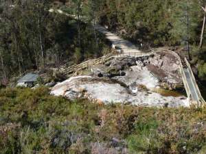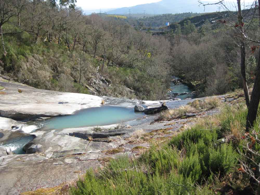 Un mirador y una espléndida pasarela de madera posibilitan el disfrute a tope del impresionante paisaje. A lo largo de unos 1.500 m. se suceden pozas y cascadas, en este tramo del río Cerves que termina en el puente de As Mestas. Es una pena que estas aguas rápidas y saltarinas que deberían ser también transparentes y limpias bajen turbias y sucias. Supongo que las truchas y demás fauna y flora fluvial serán las víctimas de tal agravio ecológico.