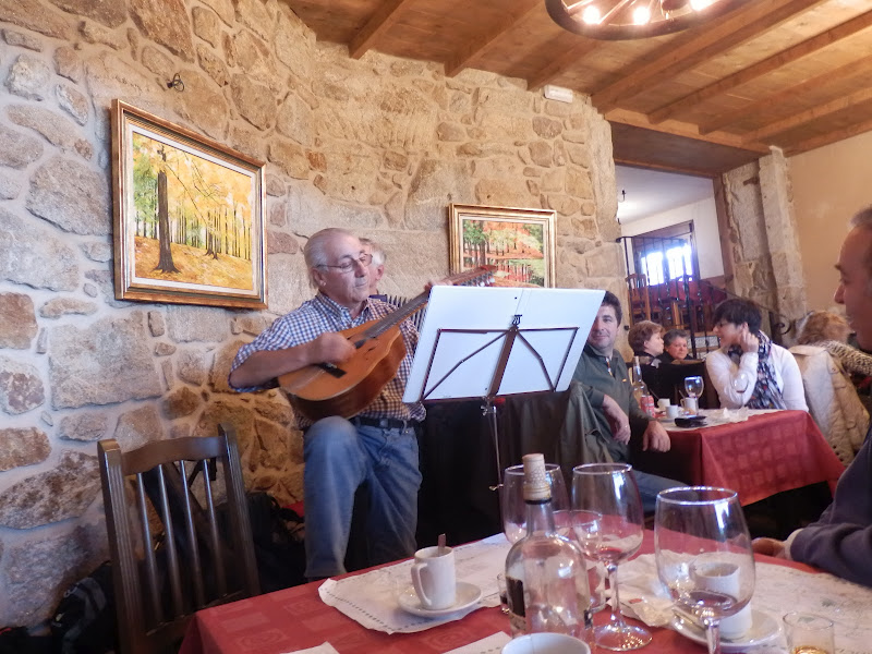 Tras un entusiasta sprint final llegamos a las dos en punto a Casa Paco en donde a los 16 caminantes se nos unieron otros 14 ex-andariegos y amigos. No nos decepcionó el restaurador con sus percebes calentitos y su sabroso cabrito regado con mencía y barrantes, rematando el festín con postres caseros de variada oferta y chupitos. En fin, perceberancia dentro y fuera de Casa Paco.