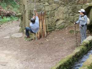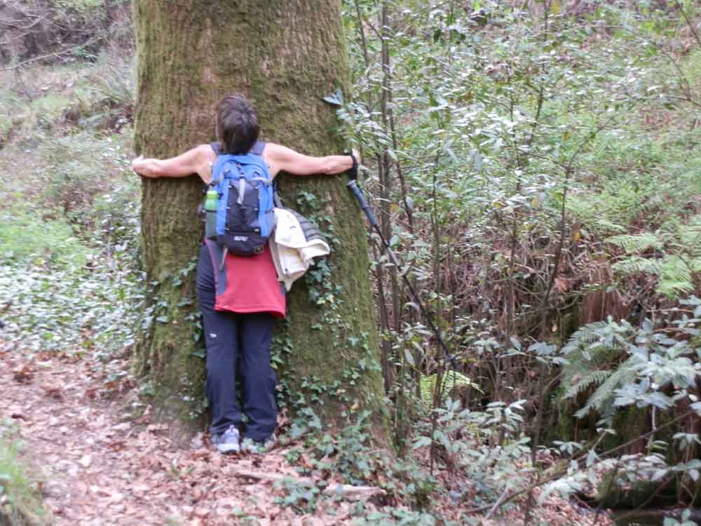 En este sitio nos detuvimos para reponer fuerzas. Un cuerda de nudos colgaba de un añoso carballo y los chicos de la Caminata sabatina no pudieron resistir la tentación de amarrrarse a la liana y balancearse como auténticos tarzanes. Acertó a pasar por allí un paisano  que se nos quedó mirando  y exclamó entre asombrado y divertido : ¡Son coma nenos!  Y tenía razón, pues nos estábamos divirtiendo  como si hubiéramos retrocedido a los años de nuestra infancia. Cosas del senderismo.