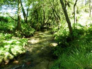 Allí, bajo la sombra de pinos, carballos y eucaliptos, nos detenemos. Mesas de piedra y de madera y una fuente que mana un generoso chorro de agua fresca son el inesperado regalo para estos caminantes que llegan aquí un tanto agobiados por este sol canicular. Después de una breve pero reparadora siesta reanudamos la marcha alcanzando pronto el cause del río Grande, que no es más grande sino de menos porte que el de Beluso, de mayor mansedumbre y estrechez pero también gracioso, de cauce límpido y sereno.