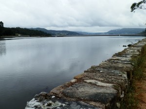 Llegados al muelle de atraque emprendemos de seguido nuestra marcha hacia la Punta Centolo pasando por la solitaria playa de Melide, dicen que nudista, pero vacía a esta horas de la mañana, seguramente porque hace demasiado fresco para andar por allí de esa guisa. Nos acompaña el graznido de la numerosas gaviotas que revolotean incansables a nuestro alrededor. Desde este lugar divisamos enfrente toda la costa, desde San Vicente de O Grove hasta Marín, destacando en medio el impresionante arenal de A Lanzada.