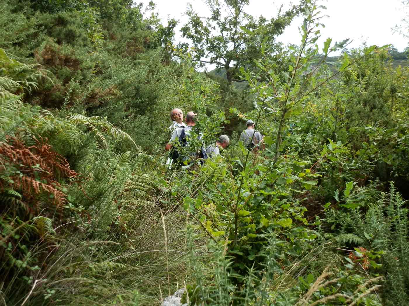 La caminata de este lunes ha sido más corta de lo habitual, un breve pero interesante recorrido por las orillas del río Sexta, cerca de Liñares, en la parroquia de Gaxate, municipio de A Lama. Como tantos otros, el río Xesta está sometido las variaciones de caudal provocadas por la mincentral instalada en sus aledaños, quizá un buen negocio para sus propietarios pero un agravio para la naturaleza tanto en el aspecto medio ambiental como en el estético con su larga y gruesa tubería de un feo color ocre atravesando el monte. Por eso, a pesar de las recientes lluvias, el río iba hoy escaso de agua.