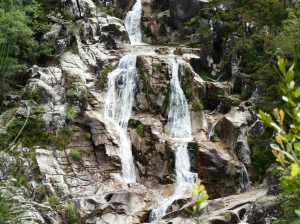 El camino, muy estrecho, entre hierbas, rocas y maleza, aunque transitable, nos obliga a caminar lentamente pero no tardamos en llegar a la cascada, un hermoso paraje que vale la pena visitar y en cuyo lecho nace la levada a la que nos hemos referido más arriba.