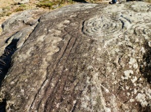 El primer tramo de la ruta, el de la mañana, discurre por pistas forestales, monte arriba a lo largo de unos 6 km. de ascensión. Nos desviamos unos cientos de metros para visitar A Pedra da Serpe, un roca con inscripciones neolíticas de las que tanto abundan en los montes gallegos. Puestos de nuevo en la ruta, subimos hasta el mirador ya citado y desde allí toca bajar hasta las inmediaciones de Pontecesures donde, en el límite con el concello de Valga, hacemos un alto para descansar y reponer fuerzas.