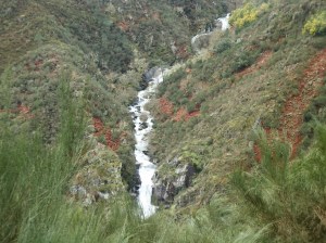 Por pistas y senderos, algunos tapizados de verde hierba y decorados con el amarillo de la mimosas en flor, no tardamos en llegar al Couto da Feixa que es donde se encuentran las Fervenzas de Codesás o de Santa Cruz, inaccesibles desde este punto que, por otra parte, es un magnífico mirador para contemplar la impresionante estampa de las aguas del río Cerves despeñándose desde más de 40 m. de altura para reanudar su agitado curso por el fondo de la vaguada.