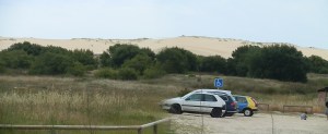 Pasada la playa de Corrubedo cambiamos de sentido y dirigimos nuestra marcha hacia la Gran Duna que se estira sobre el horizonte como el lomo casi blanco de un enorme cetáceo. Poco después llegamos a la iglesia de Santa María de Olveira muy cerca del lugar en donde habíamos iniciado la caminata de hoy.