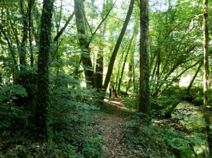 El paisaje de los primeros kilómetros combina los pinares frondosos y sombríos, de pinos bien crecidos y suelo mullido de fina hierva en su mayoría con los extensos viñedos que abundan en esta zona de clima húmedo y templado que permite la explotación, también, de numerosos viveros de plantas ornamentales.
