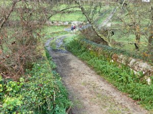 Nos hemos desviado de la ruta diseñada por nuestro amigo jesussimon para dar un rodeo y dirigirnos hacia Amoedo, de nuevo en Pazos de Borbén, en donde nos espera, en Casa Besadío, un reconfortante caldo de lentejas seguido de un suculento jabalí estofado que nos deja listos para proseguir la caminata. Dejando Amoedo a nuestras espaldas, cruzamos la PO 2901 por un estrecho sendero que nos lleva hasta el fondo del valle en donde nos encontramos otra vez con el río Pequeno. Ahora toca subir hasta la senda del agua y un poco más adelante torcer a la izquierda y tomar un precioso camino alfombrado de verde hierba que nos lleva hasta A Ermida que es donde comenzamos y terminamos esta caminata.