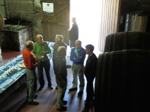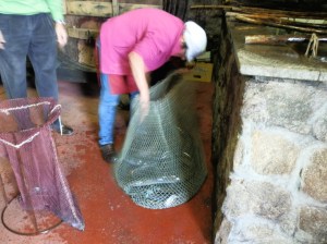 Ya estamos en O Mesón de A Lamprea. Para empezar, un aperitivo a base de jamón curado del país regado con vino del Condado, en la bodega. No tarda en aparecer la experta Flora que extrae del vivero un par de lampreas, que con su inquietantes bocas succionadoras se revuelven y resisten a ser metidas en la nasa que las llevará a la cocina para ser inmoladas en beneficio de nuestros paladares. Ya en la mesa, después de saborear unos trozos de empanada del pez ventosa, unos con  lamprea otros con cabrito, acometen ese rito tan pagano de la gula disfrutando del placer que enloquece las papilas gustativas.