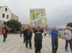 La cosa no terminó ahí y para rematar tan gozosa efemérides, salimos en procesión por la Plaza Peirado da Cousa enarbolando el cuadro de Moncho como el estandarte que expresa como nadie el lema de Sendereando: Caminar es vivir.