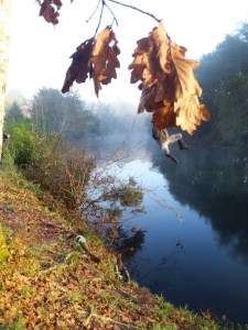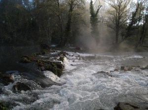Eso es lo que dice uno de los paneles informativos que se hallan en la Senda del Tea y lo he traído aquí porque expresa de forma concisa y clara cómo es este río que tantas veces hemos recorrido los de Sendereando, aunque es ésta la primera que lo hacemos por el tramo que sale de A Lomba, en el municipio de Ponteareas para, después de atravesar un espeso pinar, toparnos con sus afluente. el Mendres, una preciosa corriente de agua que baja casi azul y rebosante de espuma entre vahos de vapor, en esta fría mañana de Noviembre.