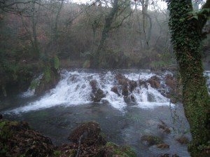 En O Chan da Gándara, por donde el Tea fluye amplio y manso, hacemos un alto para la foto en el cruceiro que allí se yergue sobre una pequeña colina de piedra siguiendo después hasta la cascada llamada A Fervenza do Croa, un brusco desnivel de baja altura en el cauce del río que provoca que sus tranquilas aguas se desplomen en un torrente pleno de fuerza y espuma.