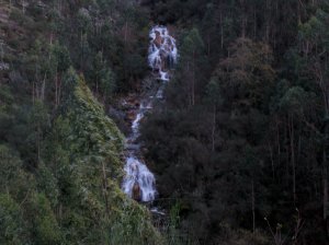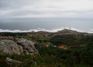 Desde Oia hasta Casa Paco, que es nuestro próximo destino, nos separan unos 10 Km. que, partiendo de los 23 m. sobre el nivel del mar en donde nos encontramos, hemos de recorrer salvando el fuerte desnivel que nos llevará a casi 6oo m. de altitud por empinadas cuestas, algunas empedradas como si fueran el cauce de un torrente, con el viento soplando en ráfagas que suenan como bofetadas, chubascos que caen sobre nosotros como calderos, los altos pinos y eucaliptos torciéndose dramáticamente, resistiéndose a la violencia del temporal que parece empeñarse con dar con sus copas en el suelo.