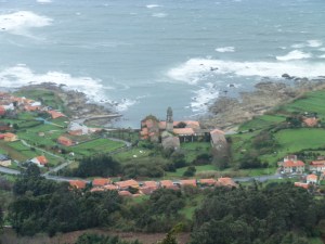 Iniciando la caminata en los altos de Viladesuso, con la hermosa costa de Oia a nuestros pies, alcanzamos los lugares de Pousadela y Outeiros do Morozo para descender desde allí hasta la capital del municipio, al borde del mar, en cuya pequeña ensenada se encuentra el monumental monasterio cisterciense de Santa María cuya iglesia, de impresionante fachada, se encuentra en condiciones aceptables porque pertenece a la parroquia pero el resto del cenobio, como no se resuelvan de una vez las cuestiones entre sus propietarios y la administración que impiden la restauración del monumento, no tardará en convertirse en una ruina más.